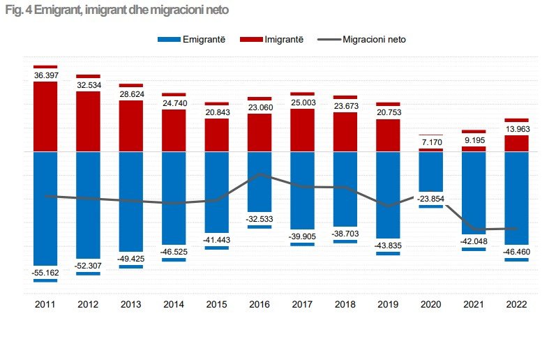 Sipas INSTAT, migracioni neto (diferenca midis imigrantëve dhe emigrantëve) shënoi një përmirësim të lehtë, krahasuar me një vit më parë: nga -32.853 në -32.497 banorë në 2022.