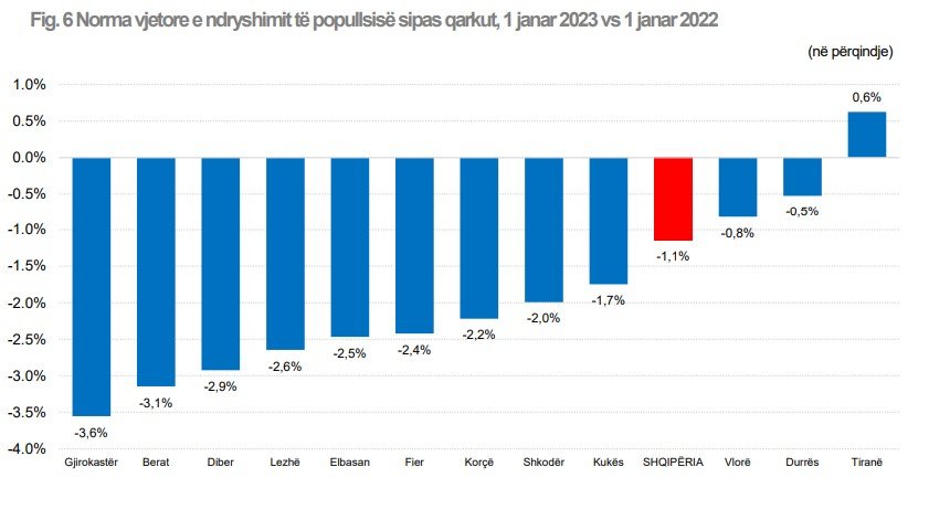 Përllogaritjet e popullsisë më 1 janar 2023 tregojnë se vetëm një qark i vendit shënojë rritje të popullsisë, krahasuar me një vit më parë, ndërsa njëmbëdhjetë qarqet e tjerë shënuan rënie të popullsisë. Rritja u shënua në Tiranë (+ 0,6%).