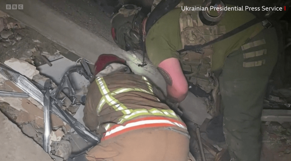 Një video e mëparshme e shpërndarë nga presidenti i Ukrainës tregoi shpëtimtarët duke kërkuar mbetjet e një ndërtese dykatëshe.