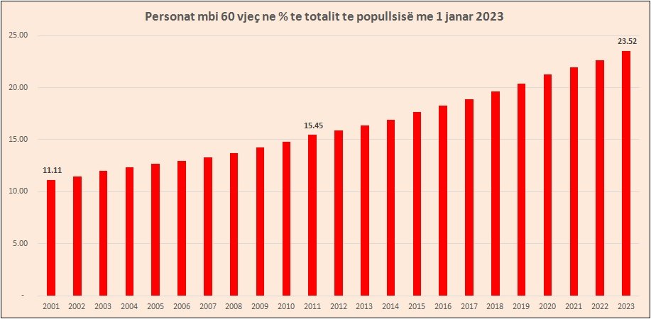 Të dhënat e INSTAT tregojnë se me 1 janar 2023 popullsia mbi 60 vjeç ishte sa një e katërta e totalit të popullsisë.