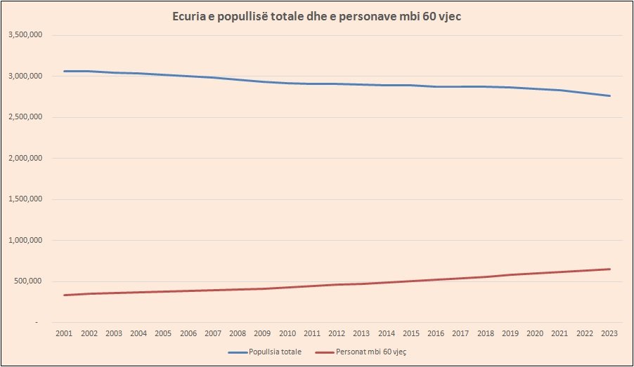 Popullsia e Shqipërisë përveç se po rrudhet me shpejtësi nga viti në vit, po pëson tranzicion, ku moshat e reja po reduktohen me shpejtësi, teksa po rritet armata e personave në moshe pensioni.