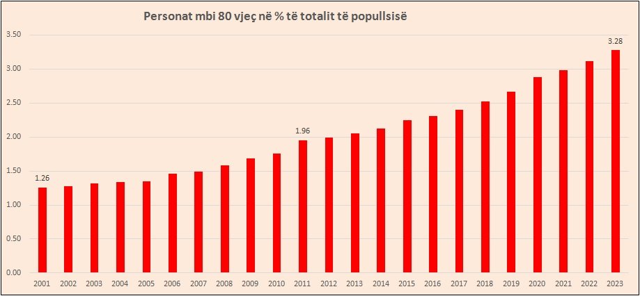 Me ritme të shpejta po rriten edhe personat mbi 80 vjeç që konsiderohet popullsia shumë e plakur. Numri i tyre arriti në 90,543 me 1 janar 2023 dhe zunë 3.3 për qind të popullsisë totale.
