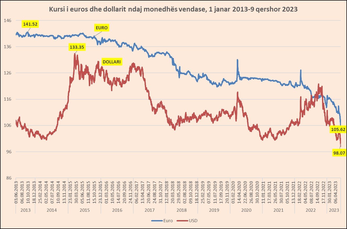 Sipas kursit zyrtar të këmbimit të Bankës së Shqipërisë, Euro u këmbye të premten me 105.62 lekë. Që nga fillimi i muajit qershor, kursi Euro-Lek ka rënë me 3.9%, ndërsa krahasuar me një vit më parë kursi i këmbimit ka rënë me 12.1%.