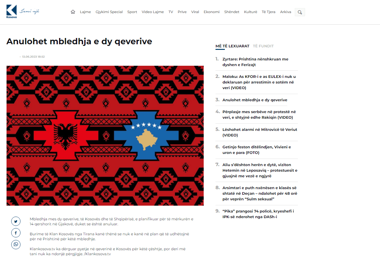 Klan Kosova raportoi se burime nga Tirana i kishin thënë se mbledhja mes qeverisë së Kosovës dhe Shqipërisë e planifikuar për tu zhvilluar në Gjakovë është anuluar.