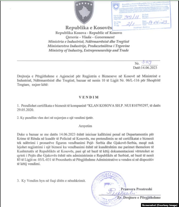 MINT ka theksuar se në bazë të akteve ligjore, Agjencia për Regjistrimin e Bizneseve e Kosovës (ARBK), “ka marrë vendim që të pezulloj certifikatën e biznesit të Shoqërisë Tregtare “KLAN KOSOVA” SHPK, deri në një vendim tjetër”.