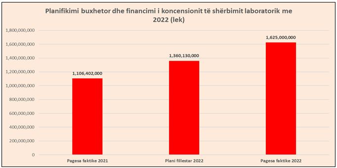 Ministria e Shëndetësisë raportoi se në vitin 2022 koncesioni i shërbimeve laboratorike, që administrohet nga kompania “Laboratory Network”, u financua me 1,6 miliardë lekë (14 milionë euro) me një rritje 47 për qind në krahasim me financimin e vitit 2021 dhe gati 20 për qind më shumë se programi fillestar.