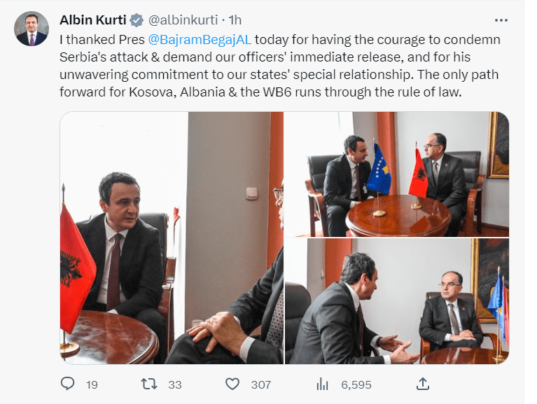 “E falënderova Presidentin Bajram Begaj sot qw pati guximin për të dënuar sulmin e Serbisë e për të kërkuar lirimin e menjëhershëm të oficerëve tanë dhe për angazhimin e tij të palëkundur ndaj marrëdhënieve speciale të shteteve tona. E vetmja rrugë përpara për Kosovën, Shqipërinë dhe gjashtë vendet e Ballkanit Perëndimor kalon përmes sundimit të ligjit”, shkruan Albin Kurti në Twitter.