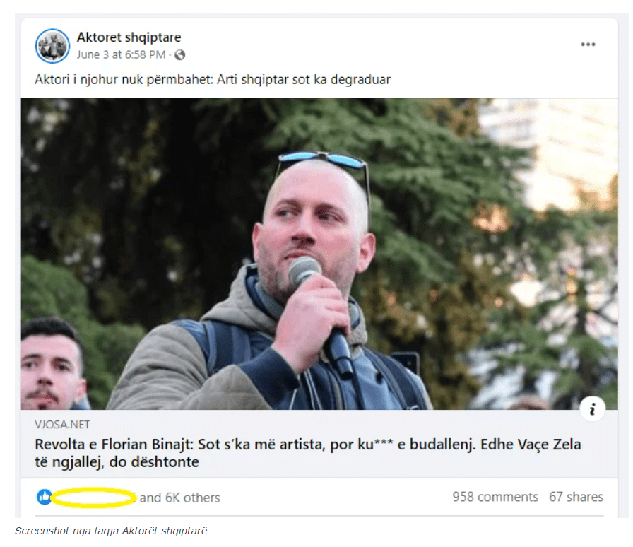 Artikulli i shpërndarë në Facebook nga faqja Aktorët shqiptarë ka marrë 6 mijë reagimë, 958 komente ndërkohë që 67 përdorues të tjerë e kanë shpërndarë në profilet e tyre.