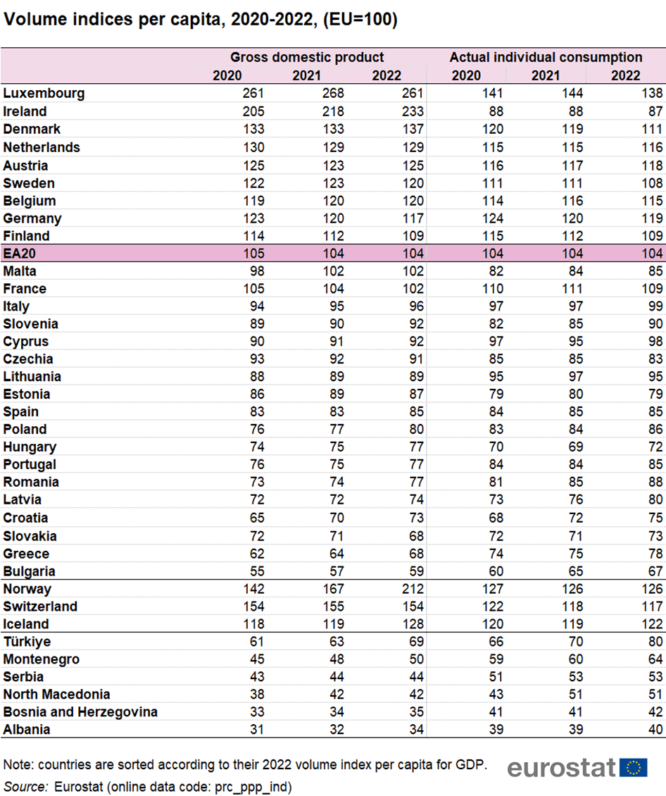 Në vitin 2022, nëntë vende të BE-së regjistruan AIC për frymë mbi mesataren e BE-së. Nivelet më të larta u regjistruan në Luksemburg (38% mbi mesataren e BE-së), Gjermani (19%) dhe Austri (18%).