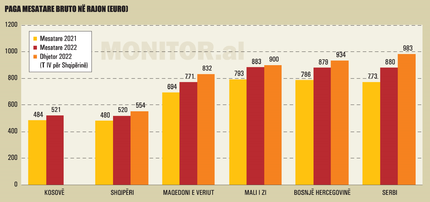 Shqipëria dhe Kosova kishin pagën më të ulët mesatare në rajon në vitin 2022, me rreth 520 euro secila (bruto). Serbia është shteti që po “fiton” në garën rajonale të pagave, që për vitin 2022 ishte mesatarisht 880 euro, ndërsa në dhjetor 2022, kërceu afër nivelit prej 1000 eurosh bruto (983 euro), sipas të dhënave nga Instituti i Statistikave i Serbisë. Maqedonia e Veriut e kishte pagën mesatare në 2022 në 771 euro, Mali i ZI 883 euro, Bosnja 883 euro.