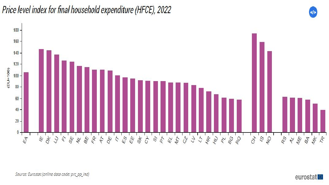 Nivelet më të larta të çmimeve u regjistruan në Irlandë (146% e mesatares së BE-së), Danimarkë (145%) dhe Luksemburg (137%). Ndërkohë, nivelet më të ulëta janë shënuar në Rumani (58%), Bullgari (59%) dhe Poloni (62%).