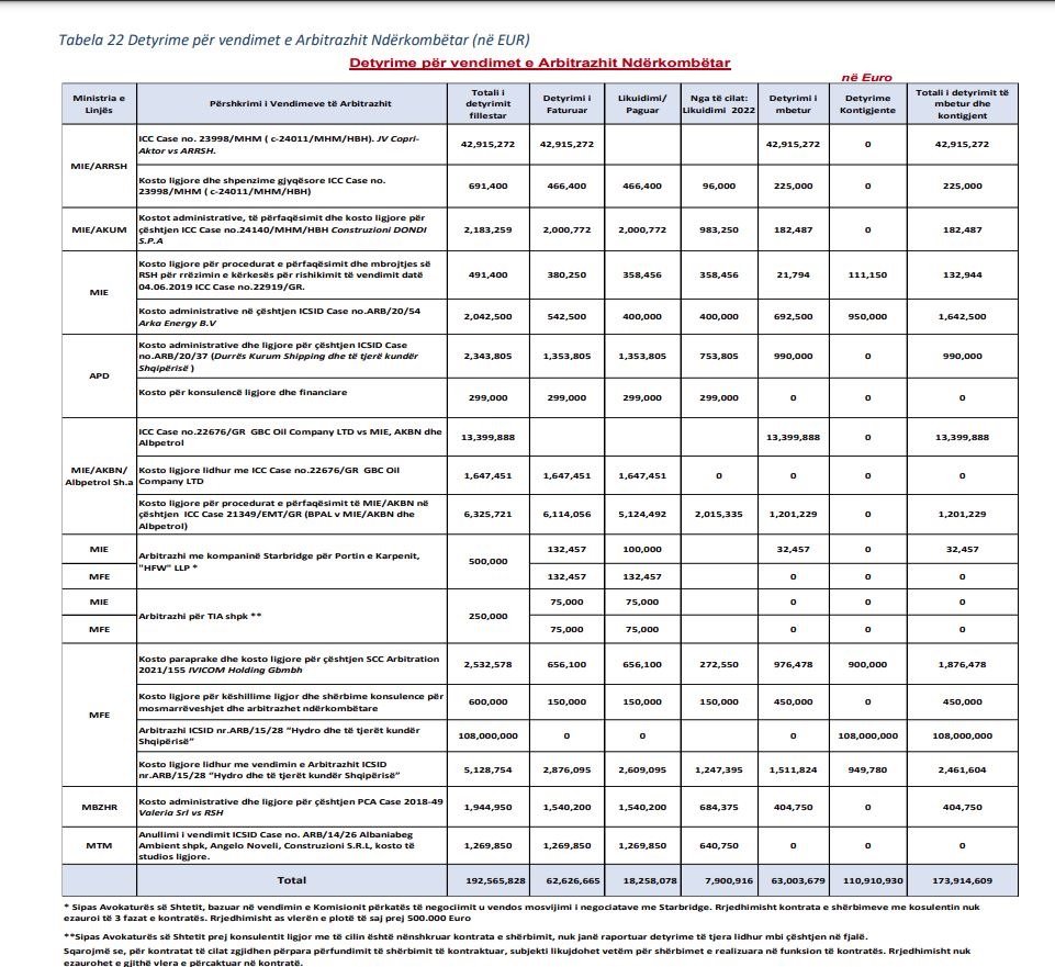 Në vitin 2022, vlera totale e kostove ligjore, të përfaqësimit, mbrojtjes, shpenzimeve gjyqësore apo kostove të tjera lidhura me vendime të arbitrazhit ndërkombëtar, të paguara nga buxheti i shtetit rezultoi në masën rreth 940.25 milionë lekë. Nga këto: