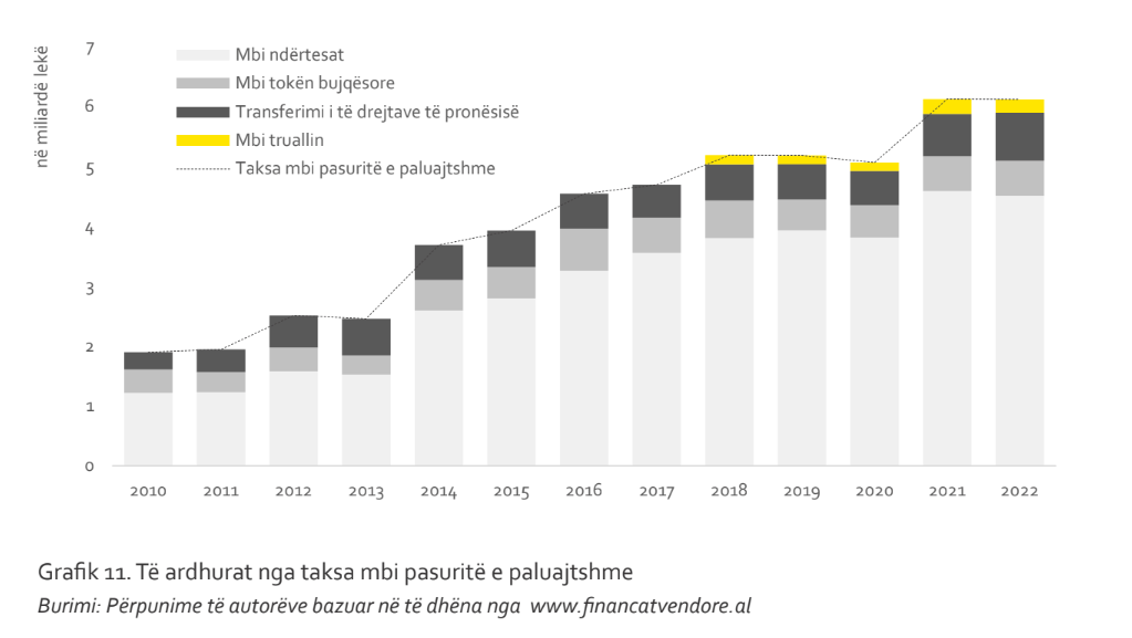 Sipas raportit mbi të buxhetin e Pushtetit Lokal, i hartuar nga Co-Plan në vitin 2022, të ardhurat nga taksa mbi ndërtesat regjistruan një nivel prej rreth 4.5 miliardë lekë, në rënie të lehtë me rreth 2% në terma vjetorë.