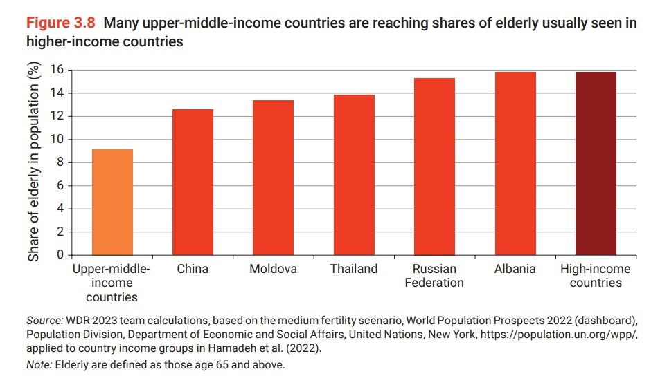 Banka Botërore vë në dukje se përqindja e të moshuarve në varësi të popullsisë në moshe pune në Shqipëri është shumë më e lartë se në vendet me të njëjtën kategori të ardhurash. Në grupin e vendeve më të ardhura të mesme të larta, ky tregues është 8 për qind, ndërsa në Shqipëri në 16%, njësoj si në vendet e me të ardhura të larta që po vuajnë prej dekadash nga plakja e popullsisë.