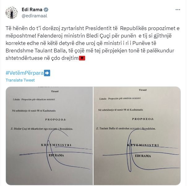 “Të hënën do t’i dorëzoj zyrtarisht Presidentit të Republikës propozimet e mëposhtme! Falenderoj ministrin Bledi Çuçi për punën e tij si gjithnjë korrekte edhe në këtë detyrë dhe uroj që ministri i ri i Punëve të Brendshme Taulant Balla, të çojë më tej përpjekjen tonë të palëkundur shtetndërtuese në çdo drejtim”, shkroi Rama.
