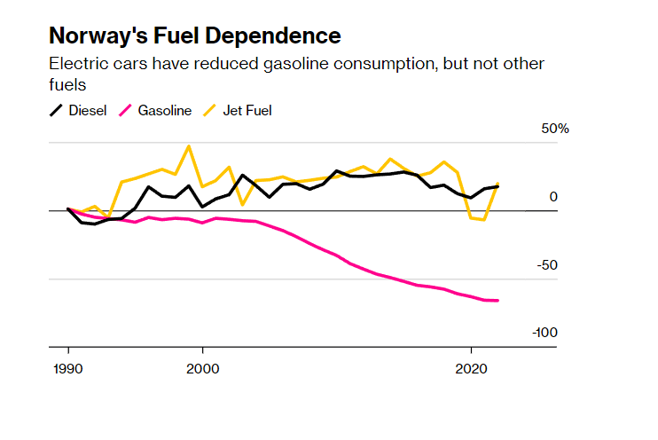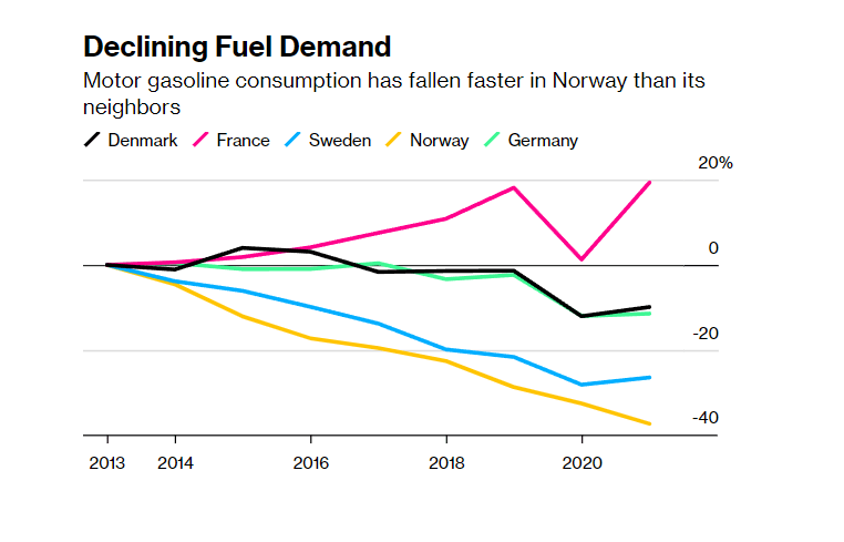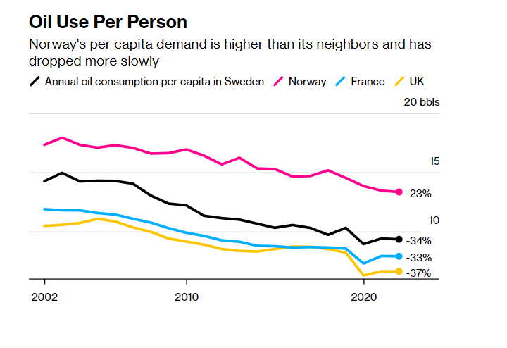 Konsumi i naftës për frymë në Norvegji ka rënë me pothuajse një të katërtën që nga viti 2002, sipas llogaritjeve të Bloomberg duke përdorur të dhënat nga Rishikimi Statistikor i Energjisë Botërore të Institutit të Energjisë. Por është ende më e lartë se shumë nga fqinjët e vendit, ku kërkesa e përgjithshme ka rënë më shpejt edhe pa adoptimin kaq të gjerë të makinave elektrike.