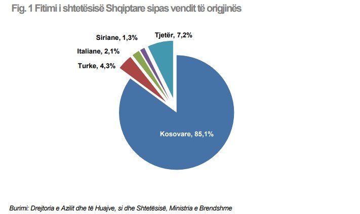 Duke analizuar vendin e origjinës të personave që kanë fituar shtetësinë Shqiptare, vërehet se 85,1% e përbëjnë ato me origjinë nga Kosova, 4,3% me origjinë nga Turqia dhe 2,1% me origjinë nga Italia.