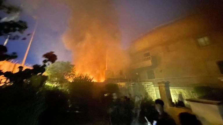 Zjarri dhe tymi mund të shiheshin në video të tjera, me shtëllunga të zeza që dilnin nga dritaret e ambasadës ndërsa protestuesit brohorisnin parulla.