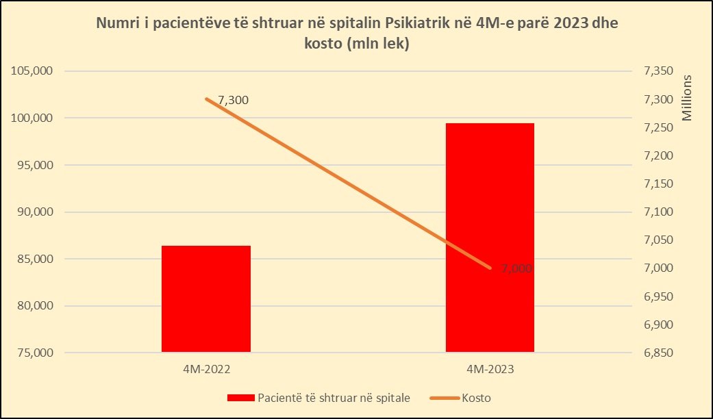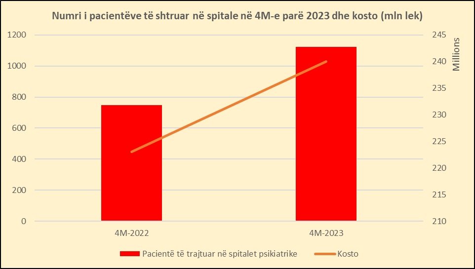 Të dhënat zyrtare nga Ministria e Shëndetësisë tregojnë në 4-mujorin e parë të vitit aktual, numri u personave të shtruar në pavijonet e psikiatrisë u rrit me rreth 50%, duke arritur në 1122 pacientë nga 749 që ishin në 4-mujorin e parë 2022.