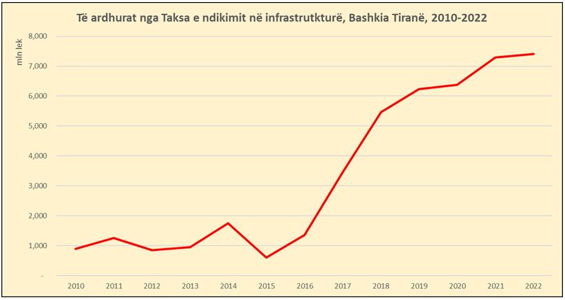 Që prej vitit 2018, taksa e ndikimit në infrastrukturë nga ndërtimet e reja ka sjellë mbi 40% të të ardhurave totale të veta të bashkisë, nga 17-25% që luhatej në vitet e mëparshme, duke e lënë kryeqytetin të varur nga lejet e ndërtimit për sigurimin e pjesës më të madhe të fondeve të veta.