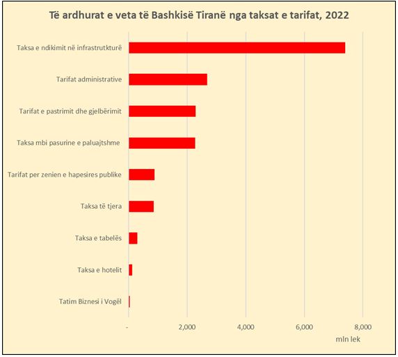 Në vitin 2022, Bashkia Tiranë mbledhur gjithsej vetë nga taksat dhe tarifat (pa përfshirë transfertat e kushtëzuara dhe taksat e ndara), rreth 16.9 miliardë lekë (gati 160 milionë euro), me një rritje prej 2.6% me bazë vjetore.