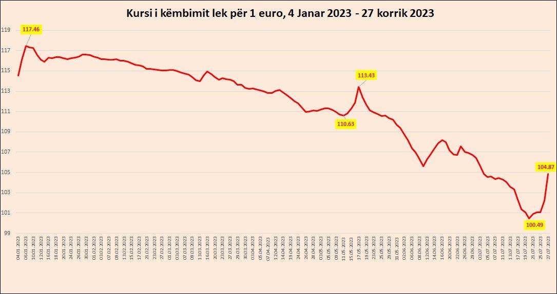 Sipas kursit zyrtar të këmbimit të Bankës së Shqipërisë, monedha europiane u këmbye në vlerën e 104.87 lekëve, në rritje me 2.65 lekë krahasuar me ditën e djeshme dhe me 4.38 lekë krahasuar me minimumin historik prej 100.49 lekëve që u arriti të enjten e kaluar.