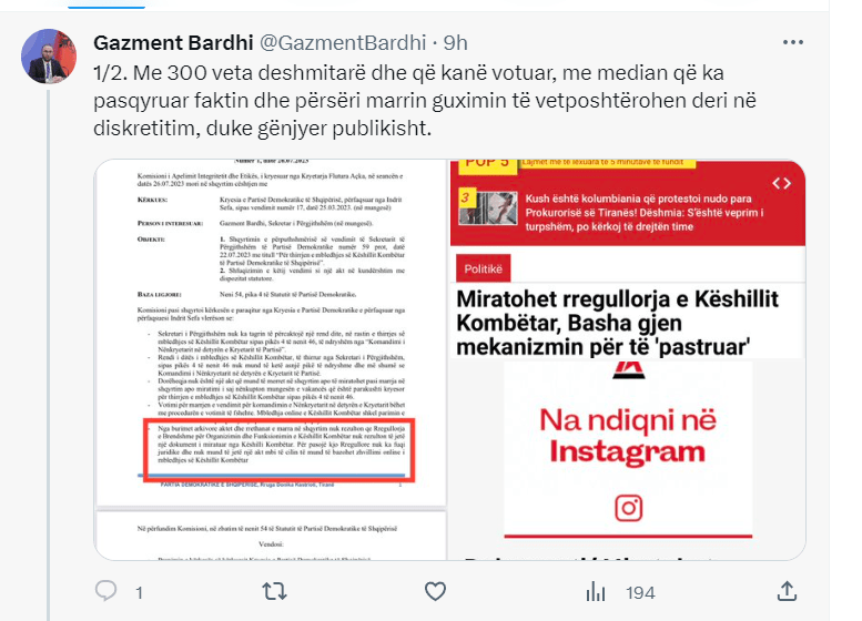 “Me 300 veta deshmitarë dhe që kanë votuar, me median që ka pasqyruar faktin dhe përsëri marrin guximin të vetposhtërohen deri në diskretitim, duke gënjyer publikisht. Këtë të detyron një hall i madh ta bësh, sepse karrigia nuk mund të jetë justifikim! Dhe ndërkohë kërkojnë tu besosh qeverisjen e jetës dhe fatit të qytetarëve shqiptarë. Nesër në orën 19:00 mblidhet Këshilli Kombëtar i PD, edhe si nevojë për të ndalur këtë turp!” – shkroi Bardhi.