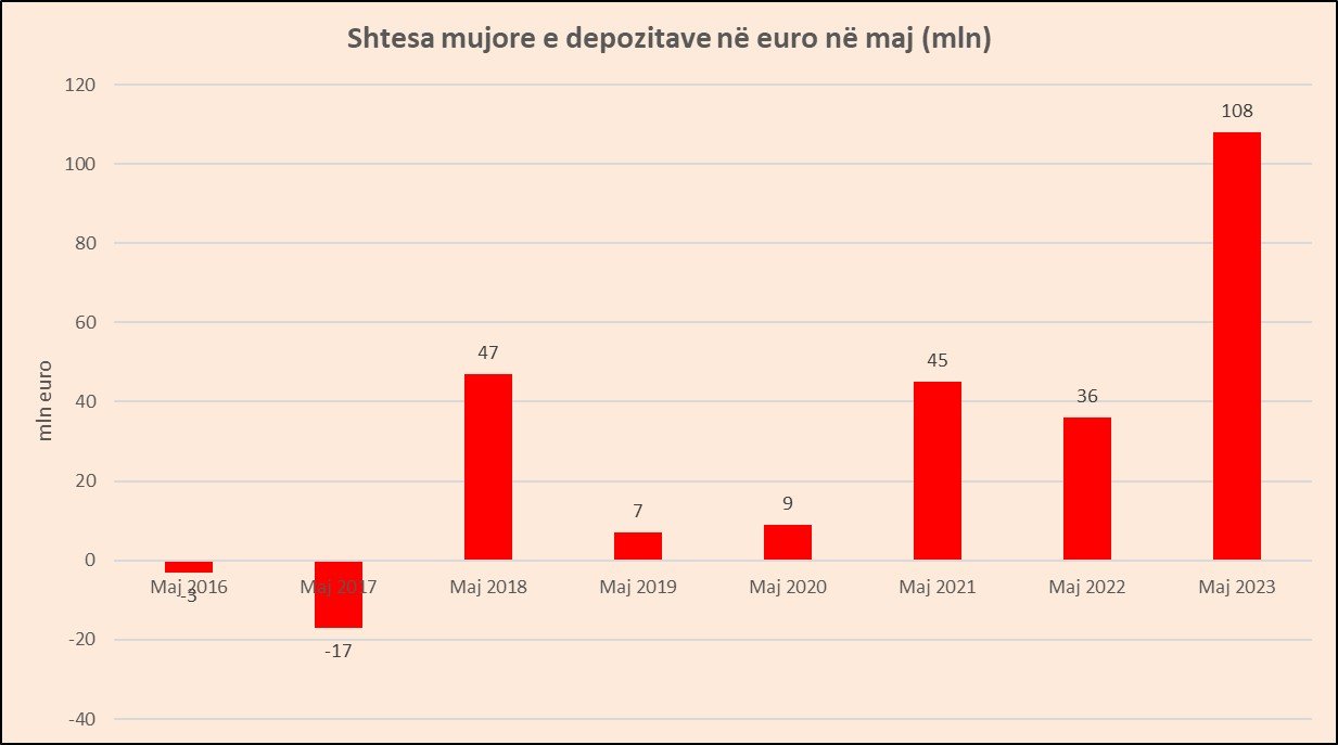 Ajo që konstatohet është një rritje mujore e pazakontë në maj, që përkon me muajin e zgjedhjeve lokale, ku kursimet në euro u shtuan me 107 milionë euro, që është rritja më e madhe mujore e regjistruar ndonjëherë në maj, që nga viti 2016, kur Banka e Shqipërisë i raporton të dhënat e ndara. Për krahasim në maj 2022 kursimet në euro ishin rritur me 36 milionë euro dhe në maj 2021 me 45 milionë euro. (shiko grafikun) Shtesa mujore e depozitave në euro në maj (mln).