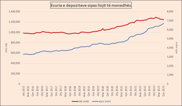Sipas Bankës së Shqipërisë, në fund të muajit qershor, stoku i depozitave në lekë arriti 547 miliardë lekë, me një rritje prej 1% në krahasim me të njëjtën periudhë të një viti më parë, ose 5.9 miliardë lekë më shumë. Kjo është rritja më e fortë që nga muaji dhjetor 2022 dhe e para pas pesë muajsh radhazi kur kursimet në monedhën vendase në banka ishin në tendencë rënëse. Rritja e qershorit ka ardhur si nga bizneset ashtu dhe nga individët.