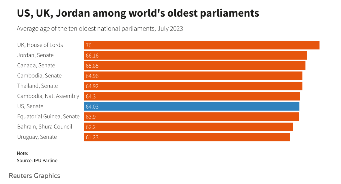 Me moshën 64-vjeçare, Senati i SHBA-së ka moshën e shtatë mesatare më të lartë të çdo organi parlamentar, duke kryesuar vendet me popullsi shumë më të vjetër, përfshirë Japoninë, Italinë dhe Greqinë.