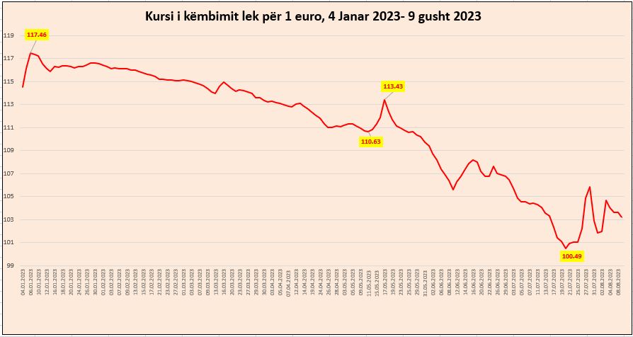 Kursi i këmbimit mes Euros dhe Lekut po zhvendoset përsëri në rënie gjatë kësaj jave. Sipas kursit zyrtar të Bankës së Shqipëris, Euro u këmbye të mërkurën me 103.21 lekë. Kursi ka pësuar rënie me afërsisht 1.2 lekë që nga enjtja e kaluar, kur u shënua rritja e fundit domethënëse, pas sinjaleve të dhëna nga Banka e Shqipërisë.