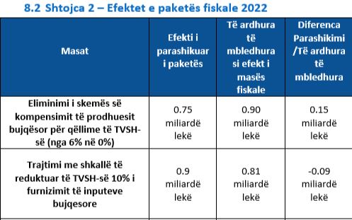 Sipas të dhënave nga Ministria e Financave 0,9 miliardë lekë u arkëtuan nga eliminimi i skemës së kompensimit të prodhuesit bujqësor nga 6 % në 0%, ndërsa 0,8 miliardë lekë u arkëtuan nga rikthimi i TVSh në inputet bujqësore.