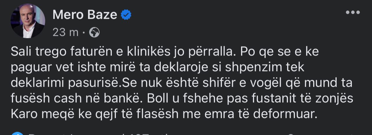 “Sali mos u nxito me Agim Zeqon se e ke zakon që thua nuk di çbën djali pastaj. Shiko kush ta ka paguar ndërhyrjen në klinikë në Vjenë. Jo për gjë por ai se mban dot nderin pa e treguar gjithandej”, –shkruante Mero Baze paradite.