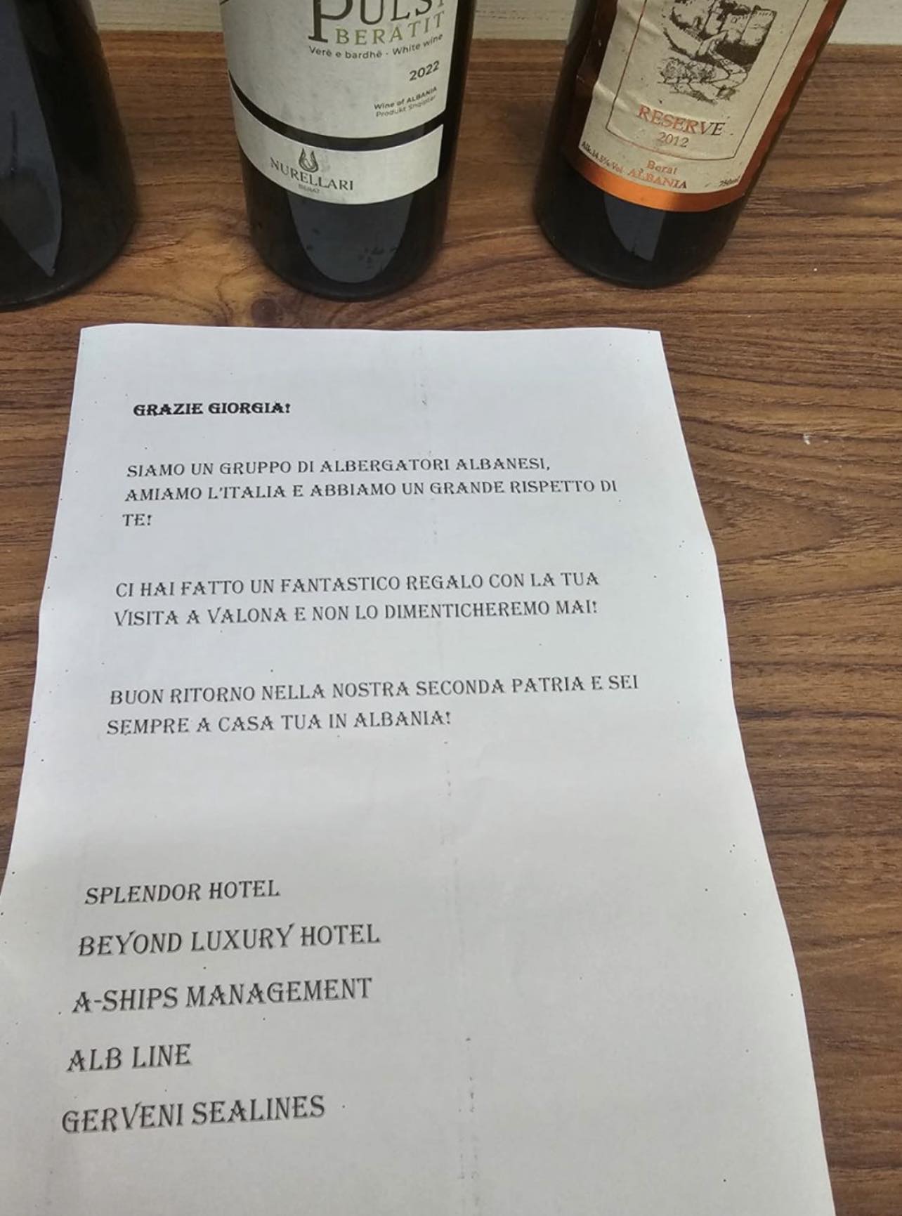 Ndërsa Giorgia Meloni nisi të akomodohej në dhomën e saj të tragetit për tu rikthyer në Itali, diku në një cep të dhomës, ndodheshin dy shishe verë dhe një letër e dedikuar për të, e nënshkruar nga disa entitete të fushës së turizmit në Vlorë.