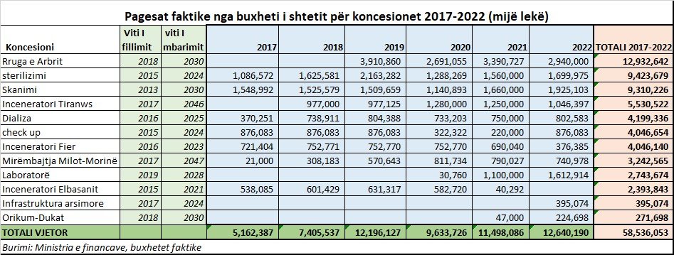 Të dhënat e Ministrisë së Financave, në buxhetet faktike 2017-2022, të përpunuara nga Monitor tregojnë se në gjashtë vjet buxheti i shtetit ka paguar në total 58.5 miliardë lekë (rreth 560 milionë euro) për 12 koncesione: Rruga e Arbrit; Skanimi; sterilizimi; Laboratorë; Inceneratori Tiranës; check up; Dializa; Mirëmbajtja Milot-Morinë; Infrastruktura arsimore; Inceneratori Fier; Orikum-Dukat; Inceneratori Elbasanit. Shuma më e lartë është dhënë për rrugën e Arbrit (12.9 miliardë lekë), sterilizimin (9.4 miliardë lekë), skanimin (9.1 miliardë lekë), inceneratorin e Tiranës (5.5 miliardë lekë)- shiko tabelën e plotë: Pagesat faktike nga buxheti I shtetit për koncesionet 2017-2022.