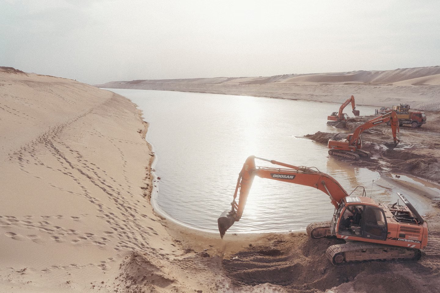 Shtrirja e parë prej 48 kilometrash është tashmë e mbushur me ujëra nëntokësore dhe punëtorët kanë eksperimentuar me rritjen e fidanëve të pemëve përgjatë brigjeve, pranë dunave të larta të rërës. Pas kësaj, kanali thahet. Terreni i rrahur nga dielli duket se nuk ka jetë, përveç shkurreve dhe punëtorëve të ndërtimit që mundohen mes shtresave të rërës dhe shkëmbinjve.