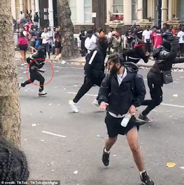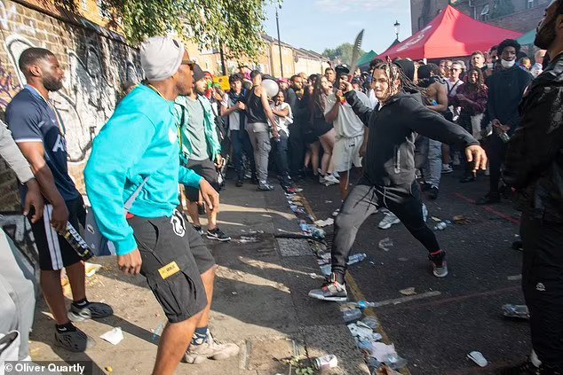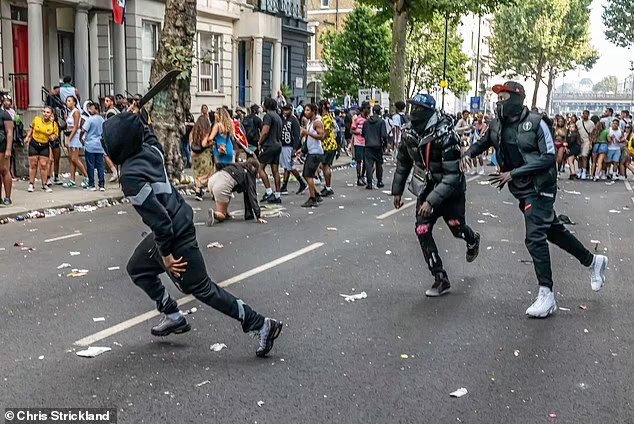 Fotografitë tronditëse shfaqin disa persona në karnavalet e Notting Hill të armatosur me hanxharë të mëdhenj në rrugë përpara turmave të njerëzve në mes të ditës.