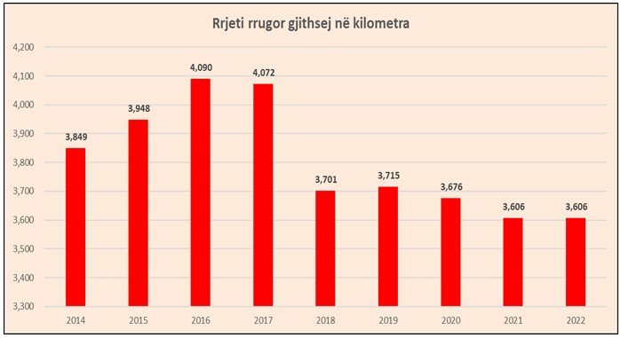 INSTAT raportoi se në vitin 2022 vendi kishte 3,606 kilometra rrugë gjithsej nga 3,848 që ishin në vitin 2014.