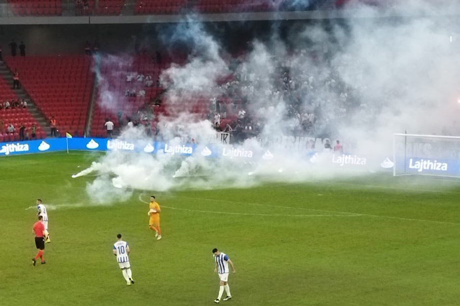 Në fillimin e ndeshjes, tifozët e të dyja skuadrave u përfshinë në një sherr masiv. Gjatë sherrit, në fushë janë hedhur sende të forta, si dhe janë dëmtuar një pjesë e stolave të stadiumit. Për shkak të përdorimit të mjeteve piroteknike, arbitri ka shtyrë fillimin e ndeshjes.