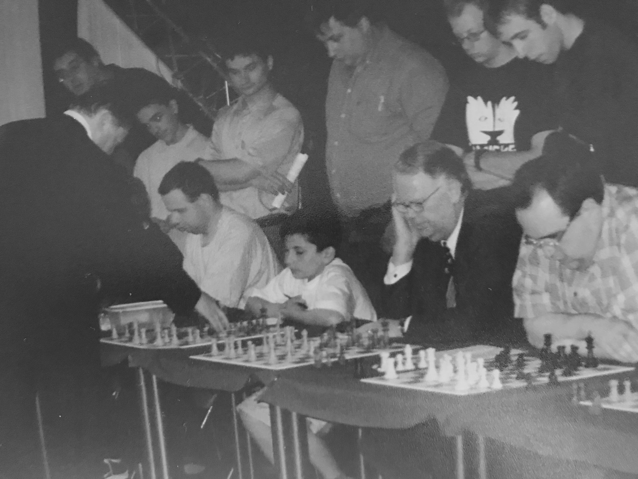 Sarkisani, atëherë 13 vjeç, luan një ndeshje kundër ish-kampionit botëror të shahut, Anatoly Karpov, në vitin 2002 në Bruksel. (Foto familjare)
