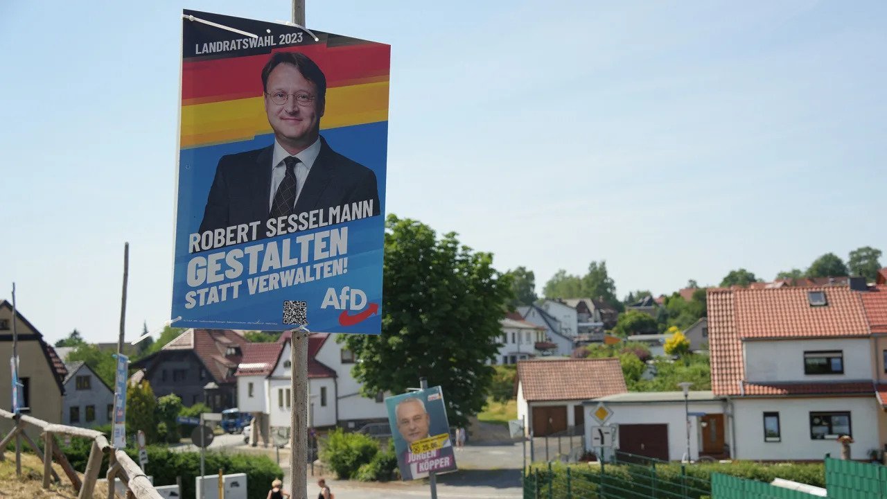 Një poster i fushatës zgjedhore tregon Robert Sesselmann të AfD-së, në një zgjedhje qarku në Sonneberg në shtetin gjerman lindor të Turingen
