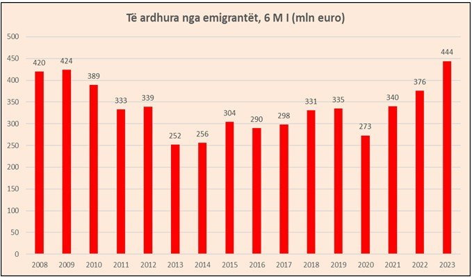 Sipas Bankës, për 6 mujorin e parë të vitit, dërgesat e emigrantëve arritën në 444 milionë euro, më një rritje prej 18% në krahasim me të njëjtën periudhë të një viti më parë.