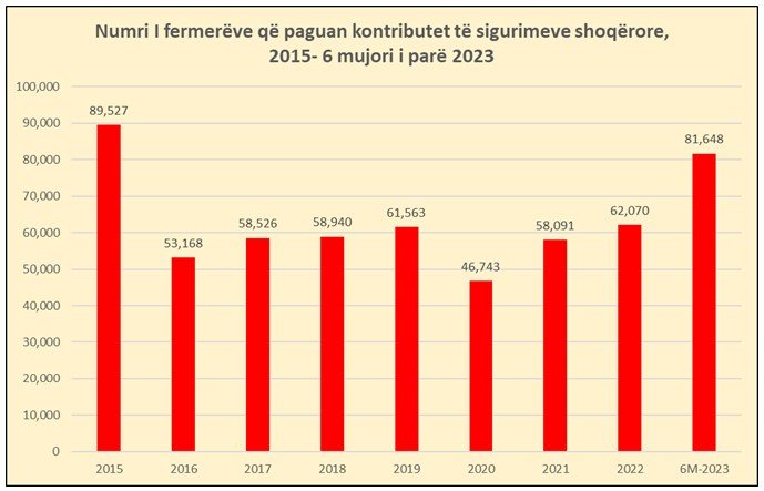 Më pas, në vitin 2015, numëroheshin 89 mijë fermerë që paguanin sigurime, ndërsa më 2017, 58 mijë fermerë në skemë me një rritje graduale deri në vitin 2020, kur për shkak të pandemisë kontribuuesit ranë në 46.7 mijë, për të arritur në rreth 82 mijë në 6-mujorin e parë 2023.