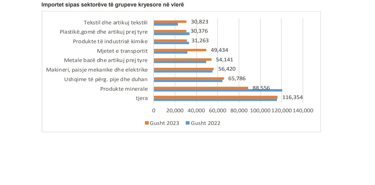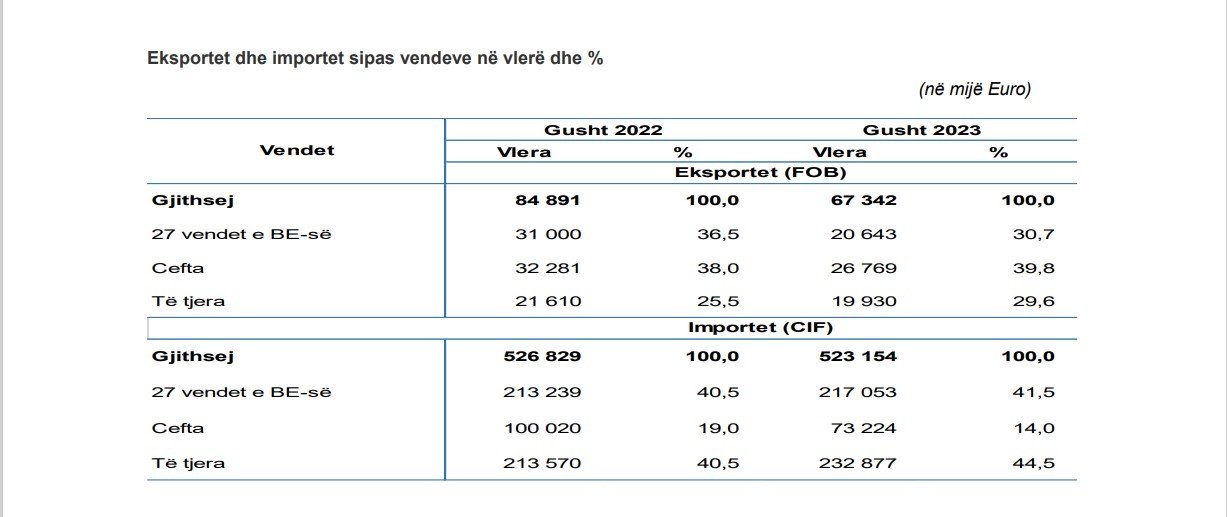 Eksporti i mallrave në muajin gusht 2023 kishte vlerën 67,3 milionë euro, ndërsa importi 523,1 milionë euro, që është një rënie prej (-20,7%) për eksport, si dhe (-0.7%) për import, duke krahasuar me periudhën e njëjtë të vitit 2022.