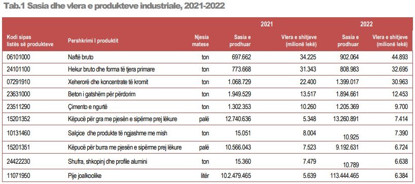INSTAT publikoi sot për herë të parë rezultatet e Anketës së Produkteve Industriale, në të cilat referohet se vlera e shitjeve të tre produkteve kryesore të industrisë shënoi vitin e kaluar rreth 1 miliardë euro.
