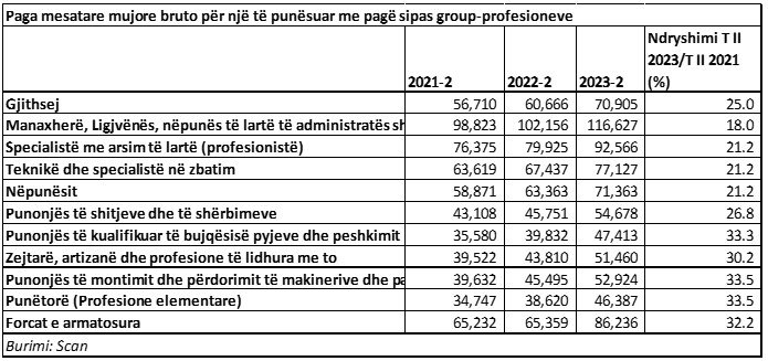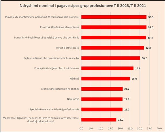 Të dhënat e INSTAT tregojnë se pagat janë rritur me ritme më të shpejta për profesione që nuk kërkojnë kualifikim të lartë si “Punonjës të kualifikuar të bujqësisë pyjeve dhe peshkimit”, “Punëtorë (Profesione elementare)”, “Punonjës të montimit dhe përdorimit të makinerive dhe pajisjeve”, të cilat në vlerë nominale në fund të tremujorit të dytë 2023 ishin mbi 30% më të larta sesa në tremujorin e dytë 2021, kur me mbarimin e pandemisë filloi të ndihej më shumë mungesa e fuqisë punëtore. Për të njëjtën periudhë paga mesatare në ekonomi u rrit me 25%, ndërsa paga për “Manaxherë, Ligjvënës, nëpunës të lartë të administratës shtetërore dhe drejtorë ekzekutivë” shënoi dhe zgjerimin më të ulët me 18%, e ndjekur nga “Specialistë me arsim të lartë (profesionistë)”, me 21%. (shiko grafikun: Ndryshimi nominal i pagave sipas grup profesioneve T II 2023/T II 2021)