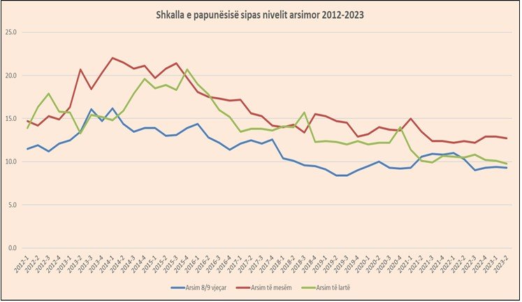 Konkretisht shkalla e papunësisë në personat me arsim 9-vjecar arriti ne 9.3 % në prill-qershor 2023 me rënie 1 pikë përqindje nga e njëjta periudhë e vitit të kaluar.