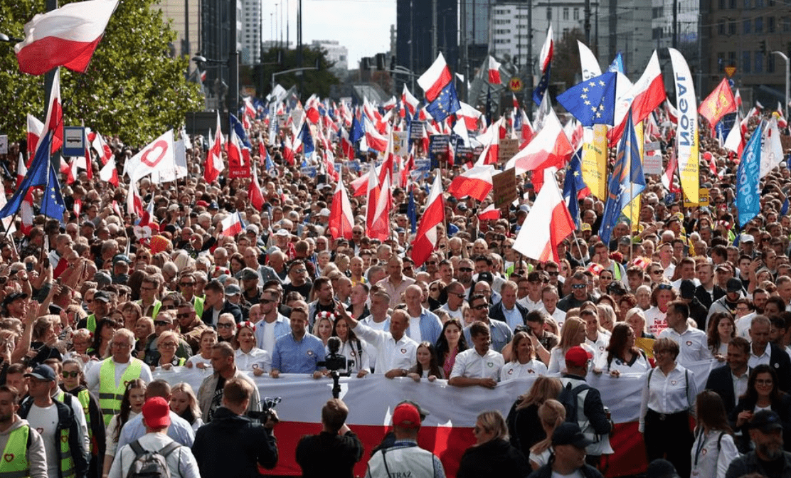 Qindra mijëra njerëz mbajtën një tubim të opozitës në Varshavë të dielën, dy javë përpara zgjedhjeve që Platforma Qytetare liberale (PO) thotë se mund të vendosin të ardhmen e Polonisë në Bashkimin Evropian dhe pozitën e saj demokratike.