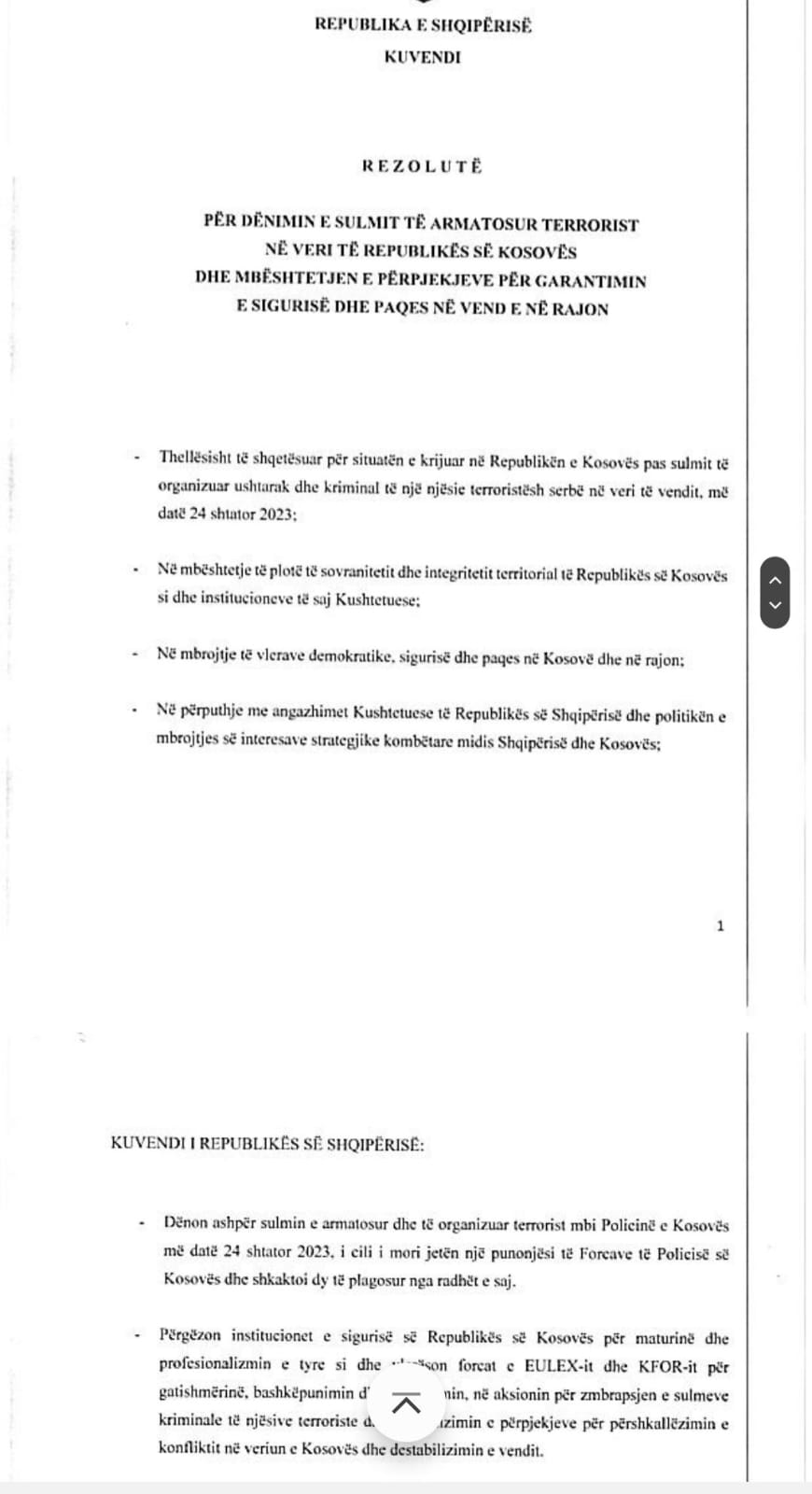 Në rezolutën në fjalë shprehet shqetësimi për situatën e krijuar pas sulmit. Ndër të tjera në rezolutë thuhet se Serbia duhet të heqë dorë nga veprimet armiqësore e luftënxitëse. “Serbia të hapë hetim serioz ndaj të gjithë organizatorëve”, citohet në rezolutë.
