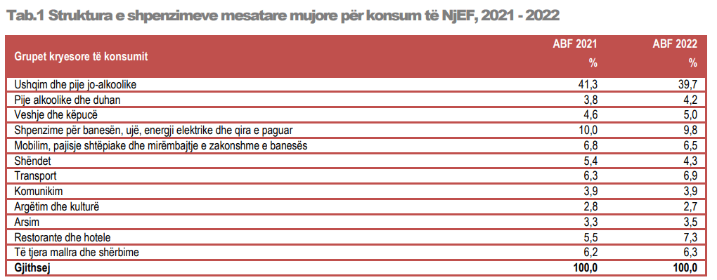 Në vitin 2022, grupi “Restorante dhe hotele” ka rezultuar me rritjen më të lartë të shpenzimeve mesatare mujore për konsum, me 37,5%, krahasuar me vitin 2021, ndjekur nga grupet: “Transport” me një rritje prej 15,7% dhe “Pije alkoolike dhe duhan” me rritje prej 14,0%. Ndërsa grupi “Shëndet” ka rezultuar me ulje të shpenzimeve mesatare mujore për konsum, me 17,2%.